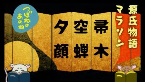 光源氏17歳ごろの夏から秋にかけてのお話。源氏が夕顔という下町の女性に出会う。夕顔を連れ出してデートしている最中、物の怪に取り憑かれて彼女を亡くす。前巻の空蝉で出てきた空蝉ちゃんと軒端の荻ちゃんも登場。腹心の乳母子・惟光も初登場。